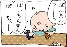 父子の会話 2008年08月17日 カテゴリ : いっくん 寝室では夫婦がダブルベッドに寝ていっくんはたいていベビーベッドに寝かせています。おとうさんといっくんが先に寝てて後から私がベッドに入ったとき・・・おとうさんが寝言を言った ( ´艸`)内容がまったく意味不明だったのでこっそり笑っていたらいっくんが返事した(寝