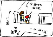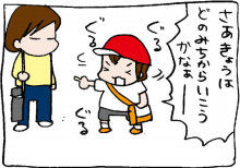 2011年06月16日 何が出るかな何が出るかな 我が家から幼稚園に行くには3通りの行き方があってどの道から行っても距離や時間はそんなにかわらないので毎朝いっくんは幼稚園にいくとき目をつぶってぐるぐるまわり止まったところで指さしている道から登園する、という儀式をしている。(めんどくさっ)さあ今日は~何が出るかな♪どこの道かな♪えーと。帰る?◆ランキング参加中◆ 「いっくん」カテゴリの最新記事 < 前の記事次の記事 > コメント コメント一覧 (2) 1. ペンギン 2011年06月16日 21:15 最後の一こまが秀逸^^ じわっと笑えてきました。 2. さな 2011年06月19日 06:35 「自分が選んだ道だから家に戻らないと行けないかな」 と一瞬考えたんでしょうね^^;