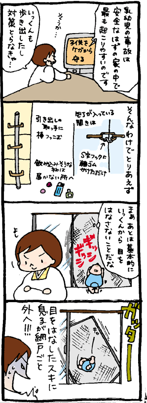 お隣の男子(当時2歳)はナチュラルに外にダイブしました。(一階ですけど…)