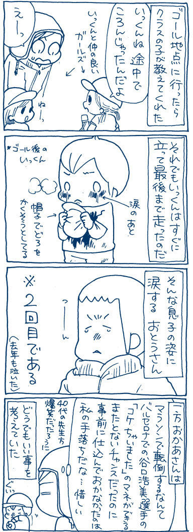 私も小学校のマラソン大会で、顔から転んだの思い出しました‥