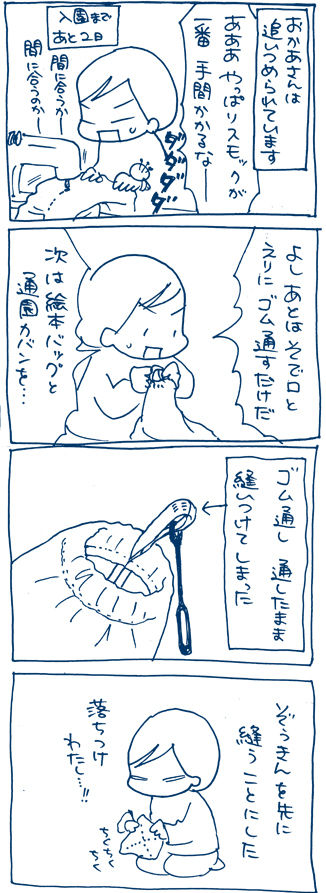 2014年04月07日 タイムリミットせまる Twitterはこちらから◆ランキング参加中◆ 「主婦業」カテゴリの最新記事 < 前の記事次の記事 > コメント コメント一覧 (12) 2. REINA 2014年04月07日 11:19 私も同じことが! ミシン、時間短縮!と思って、一気に踏んで結局曲がったりよれたりしてやり直す羽目にΣ(゚д゚;) ミシンだから縫い目ほどくの大変で、すんごい時間かかったものでした・・・ 小さいうちは、まだよかったと思ったのは・・・高校生になって、「これ明日までによろしく」と半被(はっぴ)を作れと渡された布と型紙・・・徹夜でなんとかできました( ̄Д ̄;; 9. のぶえもん 2014年04月07日 23:00 5日に入園式がありました 前日に私もようやくすべて(多分) 作り終えました 入園式当日に制服(ブレザー)の袖が 長すぎるのに気付き帰ってお直し^^; スモッグは園指定のものですが 絵具スモッグが必要でした プレで使っていたものに袖と丈を付け足し ゴムを入れ替えましたが・・ なんせ素人の作り物、ゴムが通らないんです>< 途中布を切る荒療治で(笑)なんとかしました(-_-;) やっぱ大変ですよね>< お疲れ様です<(_ _)> 5. ちよこ 2014年04月07日 12:29 糸通しを切っちゃう! 1. 爺 2014年04月07日 11:12 お母さんって大変なんだね( ´ ▽ ` ) 7. biwaemon 2014年04月07日 17:25 あらら…(^_^;) かなり焦ってますね~ 焦ってると、また失敗しちゃいますよ(^ー^) ここはコーヒーでも飲んで落ち着いてくださいな。 うさぎのレストラン屋さんにねぎ入りこーしーを配達してもらいましょう(≧∇≦) 4. 音々 2014年04月07日 11:44 母親あるあるですね☆ そのまま冷静に雑巾作りに移れるママに驚きですΣ(゚艸゚〃) うちもよくやらかしてしまいますが、星一徹バリのちゃぶ台返しをしてやろうってくらい自分に苛立ってしまいますょ(笑) 8. ひなた 2014年04月07日 21:28 さなさん凄いですよねo(^o^)o 私もさなさんみたいにカッコいいお母さん目指しますッd(。>Д・) 10. じゅじゅまま 2014年04月07日 23:36 スモックも縫うんですかΣ(゜Д゜)すごい。 袋類だけでいっぱいいっぱいです。 一人娘ゆえ、凝ったカワイイバッグ作ってたら 時間かかりすぎました(^_^;) 12. ちーまま 2014年04月08日 12:20 ぞうきんすら買う私… ああ、お裁縫スキルがほしいです…! 時間なくても全部作るあたりが 素敵すぎます(о´∀`о) 6. まぁゆ 2014年04月07日 12:40 アタシも前日に徹夜して作ったなぁ… 入学準備が怖い(笑) 3. あちゃひ 2014年04月07日 11:42 おかあさん、ファイトです!!! 完成品はブログにアップする予定はありますか? いっくんの時のを見て感動したので、はるちゃんのも見たいなぁーと((* ´艸`)) 11. 2014年04月08日 00:20 いつも楽しく見ています! ああ・・・なんか私と同じくお尻に火が付かないと活動しないひとがいる・・・と思ってしまいました☆ はい。袋類は完成しましたが、名前書きが終わっていません!(´Д`;)楽してシールを発注しましたが、思いの他シールは使わず、手書きがたんまりとあります。 前夜には終わるでしょう≧(´▽`)≦ってまだまだのんきな私です・・・