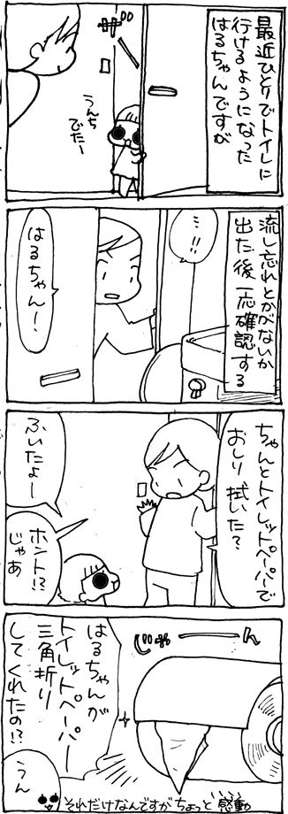 2013年12月27日 オンナのコとしてのたしなみ いっくんはそんなことしたことなかったのでちょっとカンドーしてしまったのでした。これは家なのですが、三角折をいやがる人もいるのでおでかけ先ではやらなくてもいいからね~と言いました。Twitterはこちらから◆ランキング参加中◆ 「はるちゃん」カテゴリの最新記事 < 前の記事次の記事 > コメント コメント一覧 (4) 3. 寧々mama 2013年12月27日 18:07 いつも読み逃げでした。初めてコメントします(^-^) ペーパーの三角折り、嫌がる人が多いと最近知りました(^_^;) はるちゃん、かわいいですね~☆ 子供ってほんとに周りをよく見てる(^-^) 2. 2013年12月27日 16:30 手を…てを洗った後に折ったのかな(^^;; そんな事が気になりました、特に外出先のトイレだと特にね。 4. 2013年12月28日 09:54 はるちゃん女の子~(笑) ちなみに△ペーパー?は掃除したって意味らしいですよ 1. 渦 2013年12月27日 15:13 はるちゃん…スッ、スゲー!!Σ(゚Д゚ ) たしなみバッチリですね(・ω・)b