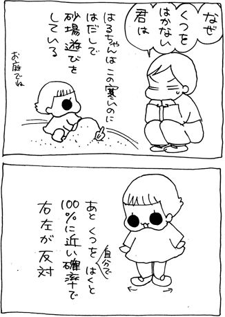 2013年12月21日 ちゃんと靴をはかない Twitterはこちらから◆ランキング参加中◆ 「はるちゃん」カテゴリの最新記事 < 前の記事次の記事 > コメント コメント一覧 (6) 6. RISAMAMA&HIROPAPA 2013年12月22日 15:14 ブログ漫画拝見させて頂いてます。 毎回、読んでいて 「あるある~♪ウチの子供たちも同じだ~」 って思いながら、楽しくホッコリ和みながら 読んでます。 この100%左右逆靴履きは・・・我が家の 長男・長女も良くなります!! 長女に関しては「偉いねぇ~ちゃんと履けたじゃん!!」って褒めるんだけど・・・ 長男には「おまえ逆!」と冷たい感じ(笑)になりがち(笑) ・・・まぁ長男に関しては長女とどうレベルで 観て欲しくでワザと手をかけてくれるように もってくるので・・・大変です。 可愛いけどね。 またブログ漫画楽しみにしています。 4. 2013年12月21日 22:30 ミズタク♪ はるちゃん、風邪ひかないでね! 1. かぼちゃ(。´・д・)o 2013年12月21日 16:53 左右逆!? 気持ち悪くないんですかねw 2. ももりん 2013年12月21日 17:01 はじめまして! いつもほのぼのさせていただいてます。 小さい子の靴の履き間違いって東西問わず、ですね。 私の住むドイツでは「アヒル足になっている」と言うようです。 「ほら、足がアヒルになってるよ。」といわれると子どもが間違いに気がつくみたい。 可愛い言い方ですよね。 いっちゃんもさることながらはるちゃんが大きくなってどんなキャラの女の子になるのかすごく楽しみです。 5. みぃやん 2013年12月21日 23:34 はじめまして^^ うちの甥っ子(5歳)も、 靴を自分で履き始めた頃から、 しょっちゅう靴を左右逆に履きますw どんなに注意しても、 直らなくて・・・ 11月に遊びに行った時も、 左右逆に履いてましたwww なんででしょうねぇwww 3. なったん 2013年12月21日 19:37 いまだにサンダル。下半身おむつ。( ̄▽ ̄;) 最近はわがまましても無理矢理はかします。 子供って意外としぶとくて強いですね。( ̄▽ ̄;)