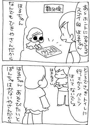 2012年09月25日 がんばり屋さん他いろいろ なにをやるにもすぐ「○○屋さん」を開業してしまうのが最近のはるちゃんのブームのようです。あと「幼稚園のお迎え行き屋さん」とか「お風呂でチューチューを食べ屋さん」とかあります。ところではるちゃんががんばってやっているのがこのパズル↓真っ白のパズルを買ってきて描きました。パズルを完成させると自分がでてくるのがうれしいようで何度でも飽きずにやっています。◆ランキング参加中◆ 「はるちゃん」カテゴリの最新記事 < 前の記事次の記事 > コメント コメント一覧 (12) 5. つくしんぼ 2012年09月25日 17:11 ぱんつはかない屋さん!!(笑) はるちゃんおもろー( ´艸`) そのパズルいいですね!白いのなんてあるんだ! うちも作ってみたいなぁ♪ でもボコボコしてて難しそう・・・(@@) はるちゃんもこんな小さいピースのもうできるんですね~♪がんばりやさん! 6. 2012年09月25日 17:34 白いパズル!懐かしい。 高校の時、授業で「保育」をとってたので、 課題でオリジナルパズルを作りなさいって つくったなぁ~。 後、余談でリアル3㎏赤ちゃん人形で お風呂の入れ方の実習があって、 リアル人形の首がごろん!とモゲタ時は 悲鳴を上げたね! まじ怖かったよ!! 10. さな 2012年11月07日 02:54 はるちゃんはおかあさんが歌うのを 聞いて覚えました。 でもyoutubeとかにもあるのかな? 1. えるる 笑顔でハッピー☆ 2012年09月25日 10:02 はるちゃんすごい! パズルって、意外に難しいですよね。 なんだか言葉もボキャブラリー色々あって早い気がしますね~。頭いいんだな~。 8. さな 2012年11月07日 02:52 そうですそうです。 空がなにもなくてさみしかったので チャーリー飛ばしましたw 11. さな 2012年11月07日 02:55 白いパズル、もう一つ買ってあるのですが これぞというイラスト案が浮かばず そのまま置きっぱなしになってます^^; 7. さな 2012年11月07日 02:51 やっぱり下の子は言葉早いですよね~ 親がおしゃべりなのも関係あるかも…^^; 4. 2012年09月25日 15:51 マンモスくん!!! えっえっ、その曲今でも聞けるんですか? CDですか?再放送ですかーー? やっぱりお母さんが絵上手だといいですね~ 私もそんなの作ってあげたい・・・ 似顔絵はアレなので名前入りかなんかでですが。。 3. *:あき:* 2012年09月25日 11:30 はるちゃんスゴいですねぇ(^o^) 1コマ目の歌ってる歌、私も小さい頃好きでした(笑) 9. さな 2012年11月07日 02:53 親の鼻歌の影響で古い歌とか よく口ずさんでますw 2. ayumi 2012年09月25日 10:14 飛んでるネコは やっぱりチャーリー??? すごい上手~(^^)v 12. さな 2012年11月07日 02:55 ああいう人形の顔、ちょっと怖いんですよね^^ 実習だから本物に近くないといけないんだけど。