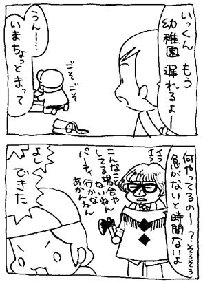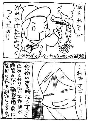 2012年03月15日 時間ないねん この時たぶん「あ、ケンダマジック作ろう」と頭に浮かんだ瞬間、今登園前だということをスコンと忘れたんだと思います。とりあたまのいっくんはなにをやってても三歩歩けばなんでも忘れる天才だ。そしてそれは私からの遺伝だ、わはは。◆ランキング参加中◆----------------◆投票方法◆件名に【子育て部門・12番 さな】と入力して(本文は自由です)送信するだけでOK!!PCの方→PC用投票ページ / 携帯の方→携帯用投票ページ 「いっくん」カテゴリの最新記事 < 前の記事次の記事 > コメント コメント一覧 (3) 3. あとみ 2014年11月27日 14:23 今までこっそり見てました。このベーターさんか好きで今更ながらコメントしちゃいました!スッゴく似てる!絵が上手で羨ましいです! では、お身体に気をつけて! 2. さな 2012年03月16日 05:03 さてはごっつ世代ですか!(*^o^*) 私もこの日の4コマの山場は2コマ目だと思ってます(^◇^;) 子どもってのべつ楽しいこと考えてるんだろうけど 大人が急いでる時は今そんなことしなくても~って 思っちゃうんですよね(ーー;) 1. つぶら 2012年03月15日 22:24 ベーターさんに吹き出しちゃいました(笑) (*´艸`) どうして子供って、時間ないときに色んな楽しいことを思い付いちゃうんでしょうね(笑) パーティー行かなきゃならないのに(笑) かくいう私も、3歩 歩けば忘れちゃう鳥頭ですが…(ノ∀`;)