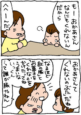 2012年01月16日 また「誰が○○やねん」 飛べない豚はただの豚だあ!↑なんかおかあさんすごくいじわるみたいだけどこの時子どもは子どもでちゃんとおやつ食べてたんですよ。マジカルバナナの件といい最近いっくんがおかあさんの太ってる事をネタにしてきておかあさん困っちゃう。◆ランキング参加中◆ 「いっくん」カテゴリの最新記事 < 前の記事次の記事 >