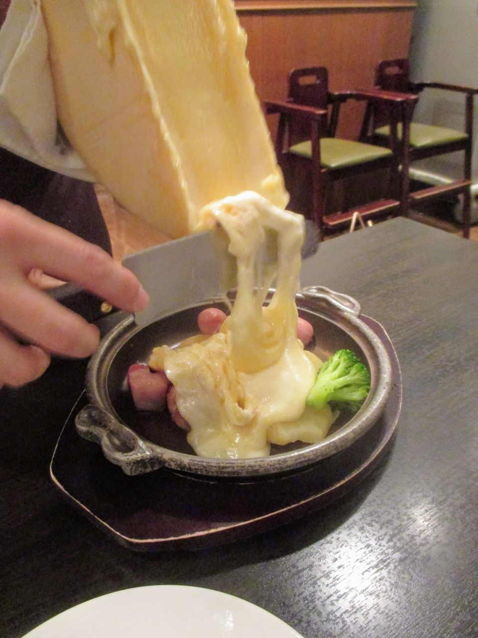 目の前で溶かしたラクレットチーズを料理にかけてくれる
