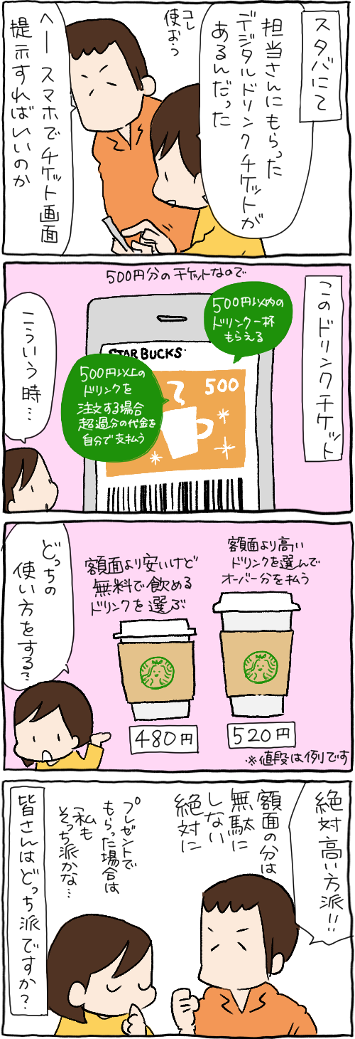 2020年01月18日 「一杯無料」ドリンクチケットの使い方 例えば店から粗品でもらったチケットやポイントの特典かなんかでもらったチケットだったらあまり何も考えずに欲しいもの頼みそうな気がするけどギフトとしていただいたものだとまた考え方変わってくるような。ーーーサブブログもどうぞ! ーーー ゆかいな猫まんが!『おふぐりさま』 ーーー『たぶんそのぶんふたりぶん』更新されてます! ーーーレタスクラブニュースのこちらの記事もどうぞ ーーーこちらもひきつづきよろしくお願いします!ハンドメイドで楽しい毎日! わるのりてづくり [単行本]前川 さなえ二見書房2017-04-245歳だって女。 (メディアファクトリーのコミックエッセイ) [単行本]前川 さなえKADOKAWA2016-02-19ぷにんぷにんぷ [単行本]前川 さなえ幻冬舎2016-03-10ぷにんぷかあさん 今日も育児日和 [Kindle版]前川さなえマイナビ出版2014-04-25ーーー↓今日もポチッとお願いします。にほんブログ 「おかあさん」カテゴリの最新記事 < 前の記事次の記事 > コメント コメント一覧 (4) 4. みるく 2020年01月20日 00:13 独身時代は高い方で、結婚してから安い方になりました。 とにかく手持ちのお金が減らないように考えるようになりましたね〜。 3. ままりん 2020年01月19日 21:48 絶対に高い方を選びます! なんなら5000円の商品券とかなのに、8000円の物とか買っちゃいます… 2. ぞうさん 2020年01月18日 22:49 私も高い方を選びますね。 絶対そっちの方がお得ですし、いっぱい飲めるので。 1. とっぽ 2020年01月18日 10:04 私はどんな時でもオーバー分を払う派です!笑 絶対全額使い切りたい!