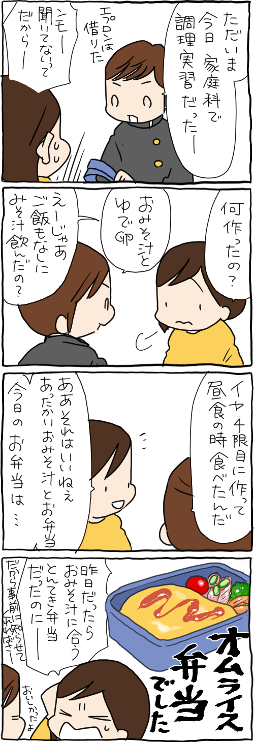 2020年02月06日 調理実習はお弁当のお供 ーーーサブブログもどうぞ! ーーー『たぶんそのぶんふたりぶん』更新されてます! ーーー ゆかいな猫まんが!『おふぐりさま』 ーーーレタスクラブニュースのこちらの記事もどうぞ ーーーこちらもひきつづきよろしくお願いします!ハンドメイドで楽しい毎日! わるのりてづくり [単行本]前川 さなえ二見書房2017-04-245歳だって女。 (メディアファクトリーのコミックエッセイ) [単行本]前川 さなえKADOKAWA2016-02-19ぷにんぷにんぷ [単行本]前川 さなえ幻冬舎2016-03-10ぷにんぷかあさん 今日も育児日和 [Kindle版]前川さなえマイナビ出版2014-04-25ーーー↓今日もポチッとお願いします。にほんブログ 「いっくん」カテゴリの最新記事 < 前の記事次の記事 > コメント コメント一覧 (3) 3. にんにん 2020年02月07日 07:27 ゆで卵とオムライスで卵もかぶってますぞ! 2. こゆき 2020年02月06日 07:19 おはようございますm(._.)m やっぱり調理実習ってお昼前ですよね~ うちの息子の中学、1時間目からでして… 給食もしっかりあるんです💦 おかげでお腹壊しましたよ( 。゚Д゚。) 1. いーちこ 2020年02月06日 07:12 いっくんwこういうとこ 普通の男子中学生って感じwww 具合悪い時まで、周りを気遣う天使〜なとこもすきだけど こういうとこも好きw