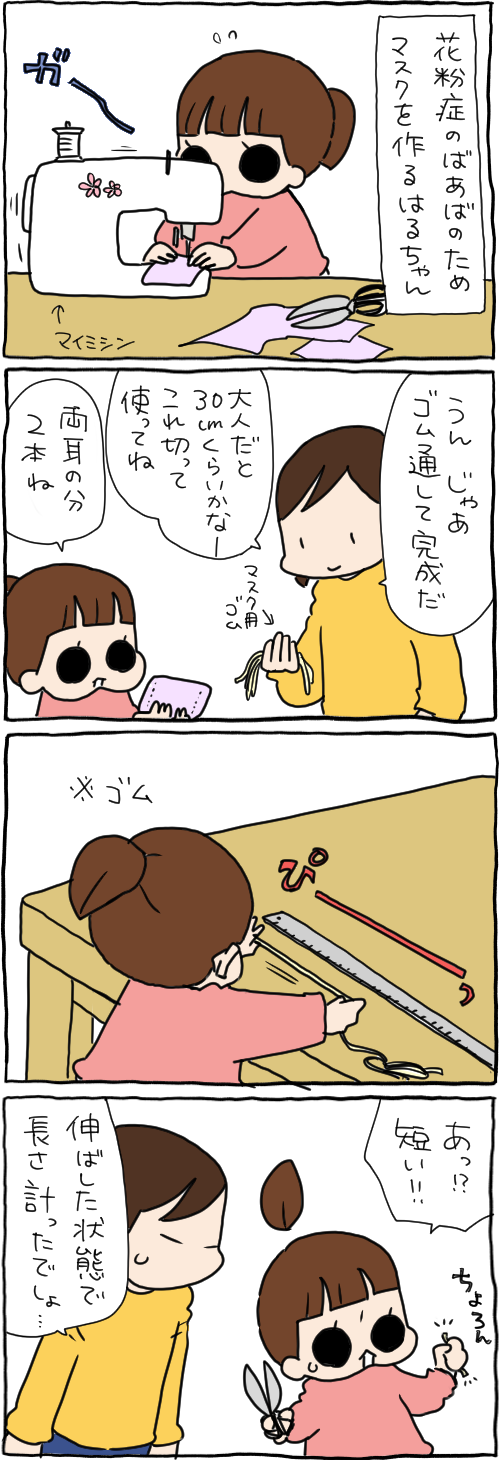 2020年03月07日 マスクのゴムも貴重なんだぞ今 はるちゃんがつくったマスクの作り方はサブブログに書いてあります。簡単なので作ってみてね。↓↓↓ーーーサブブログもどうぞ! ーーー『たぶんそのぶんふたりぶん』更新されてます! ーーーConcent掲載の企画モノコミックエッセイ新作です! ーーー ゆかいな猫まんが!『おふぐりさま』ラストにおふぐりさまが言った言葉が… ーーーレタスクラブニュースのこちらの記事もどうぞ ーーーこちらもひきつづきよろしくお願いします!ハンドメイドで楽しい毎日! わるのりてづくり [単行本]前川 さなえ二見書房2017-04-245歳だって女。 (メディアファクトリーのコミックエッセイ) [単行本]前川 さなえKADOKAWA2016-02-19ぷにんぷにんぷ [単行本]前川 さなえ幻冬舎2016-03-10ぷにんぷかあさん 今日も育児日和 [Kindle版]前川さなえマイナビ出版2014-04-25ーーー↓今日もポチッとお願いします。にほんブログ 「ハンドメイド」カテゴリの最新記事 < 前の記事次の記事 > コメント コメント一覧 (1) 1. らん 2020年03月07日 15:53 最後のはるちゃんのポニーテールまで切れてるのがかわいい!