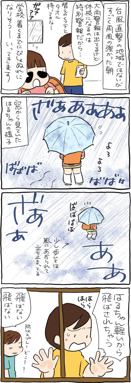 2020年09月07日 台風の朝 「今まで経験がないほどの」暴風大雨が予想されると言われていた今回の台風。みなさん無事過ごされますように。ーーーレタスクラブニュースのwebレタス隊掲載されています。 こちらの記事もどうぞ! ーーーサブブログもどうぞ! ーーーゆかいな猫まんが!『おふぐりさま』 ーーー『たぶんそのぶんふたりぶん』更新されてます! ーーーこちらもひきつづきよろしくお願いします!ハンドメイドで楽しい毎日! わるのりてづくり [単行本]前川 さなえ二見書房2017-04-245歳だって女。 (メディアファクトリーのコミックエッセイ) [単行本]前川 さなえKADOKAWA2016-02-19ぷにんぷにんぷ [単行本]前川 さなえ幻冬舎2016-03-10ぷにんぷかあさん 今日も育児日和 [Kindle版]前川さなえマイナビ出版2014-04-25ーーー↓今日もポチッとお願いします。にほんブログ 「おかあさん」カテゴリの最新記事 < 前の記事次の記事 > コメント コメント一覧 (2) 2. 嫁 2020年09月07日 20:34 沖縄県だと台風関連の警報出たら普通に交通機関はストップし有無を言わさず休校です。会社もお休みになるとこ多いですよーこんな時に通勤となるとブラック企業扱いです。台風慣れしてる沖縄ですらそうなのでどこの県もそれが普通になると良いのに。傘飛ばされて人に刺さるので風の強い時は諦めてラッシュガードですよ。 1. ぱん 2020年09月07日 14:53 特別警報でしか休校にならないのは不安ですね。警報で自宅待機が普通かと思ってた……大雨や暴風警報でもものが飛んできたり大雨で見えなかったり側溝に落ちてもかなり危険だと思うのだけれど……