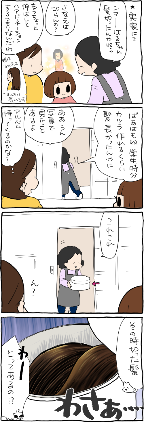2022年11月03日 昔ばあばが髪長かった証拠① 髪を切っ(ってこけし化し)たはるちゃん怖っ箱いっぱいの人毛怖っわ学生時代腰くらいまで長くてずっとおさげ髪だったのですがバッサリ切る時に床屋さんが「これはとてもきれいな髪だから」と残してくれたそうです。半世紀以上前に切ったことになりますが未だツヤツヤきれいで天然モノってすげー【続き】 ーーーゆかいな猫まんが!おふぐりさま最新話はこちらから↓ひとつ前のお話はこちらーーー『たぶんそのぶんふたりぶん』も更新されてます! ーーーレタスクラブニュース レタスフレンズ『やってみた』記事です PR記事もよろしくお願いしますーーーサブブログもどうぞ! ーーーYoutubeはじめましたよければチャンネル登録よろしくお願いします!ーーーこちらもひきつづきよろしくお願いします!ハンドメイドで楽しい毎日! わるのりてづくり [単行本]前川 さなえ二見書房2017-04-245歳だって女。 (メディアファクトリーのコミックエッセイ) [単行本]前川 さなえKADOKAWA2016-02-19ぷにんぷにんぷ [単行本]前川 さなえ幻冬舎2016-03-10ぷにんぷかあさん 今日も育児日和 [Kindle版]前川さなえマイナビ出版2014-04-25ーーー↓今日もポチッとお願いします。にほんブログ 「おかあさん」カテゴリの最新記事 < 前の記事次の記事 >